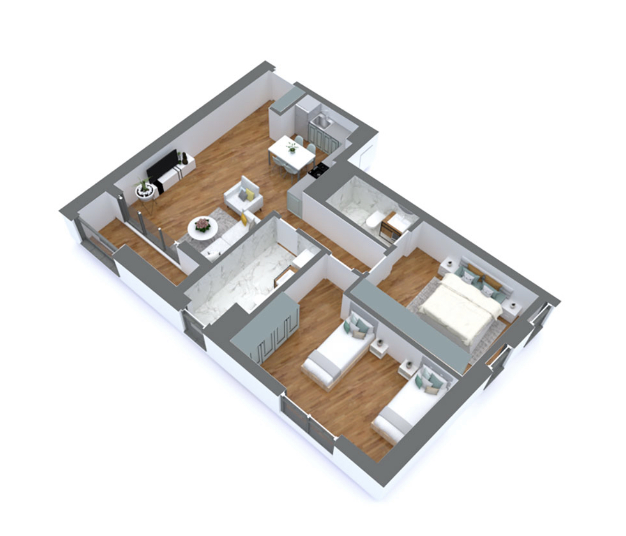 Shes apartament me sipërfaqe 103.9 m2, me një orientim të dyanshëm veri-perëndim dhe jug-perëndim. Hyrja realizohet në zonën e ditës e cila ka akses dhe diellëzohet nga llozha me orientim veri-perëndimor. Më pas me anë të një korridori bëhet lidhja me tualetin dhe dhomat e gjumit. Dhoma e fëmijëve ka dritare me orientim veri-perëndim. Dhoma matrimoniale ka dy dritare me orientim jug-perëndim dhe një tualet të dedikuar.