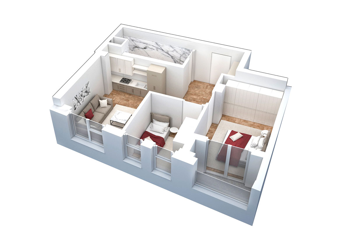 Apartamenti ndodhet ne katin e pare te nje objekti ne ndertim. Punimet jane cilesore, nder to: fasade e ventiluar, hidroizolim, izolim akustik dhe sistem qendror ngrohje dhe ftohje. Ka siperfaqe totale prej 75.6 m2 dhe siperfaqe te brendshme prej 65.6 m2 te organizuar ne sallon dhe kuzhine, dy dhoma gjumi, nje tualet dhe llozhe.
