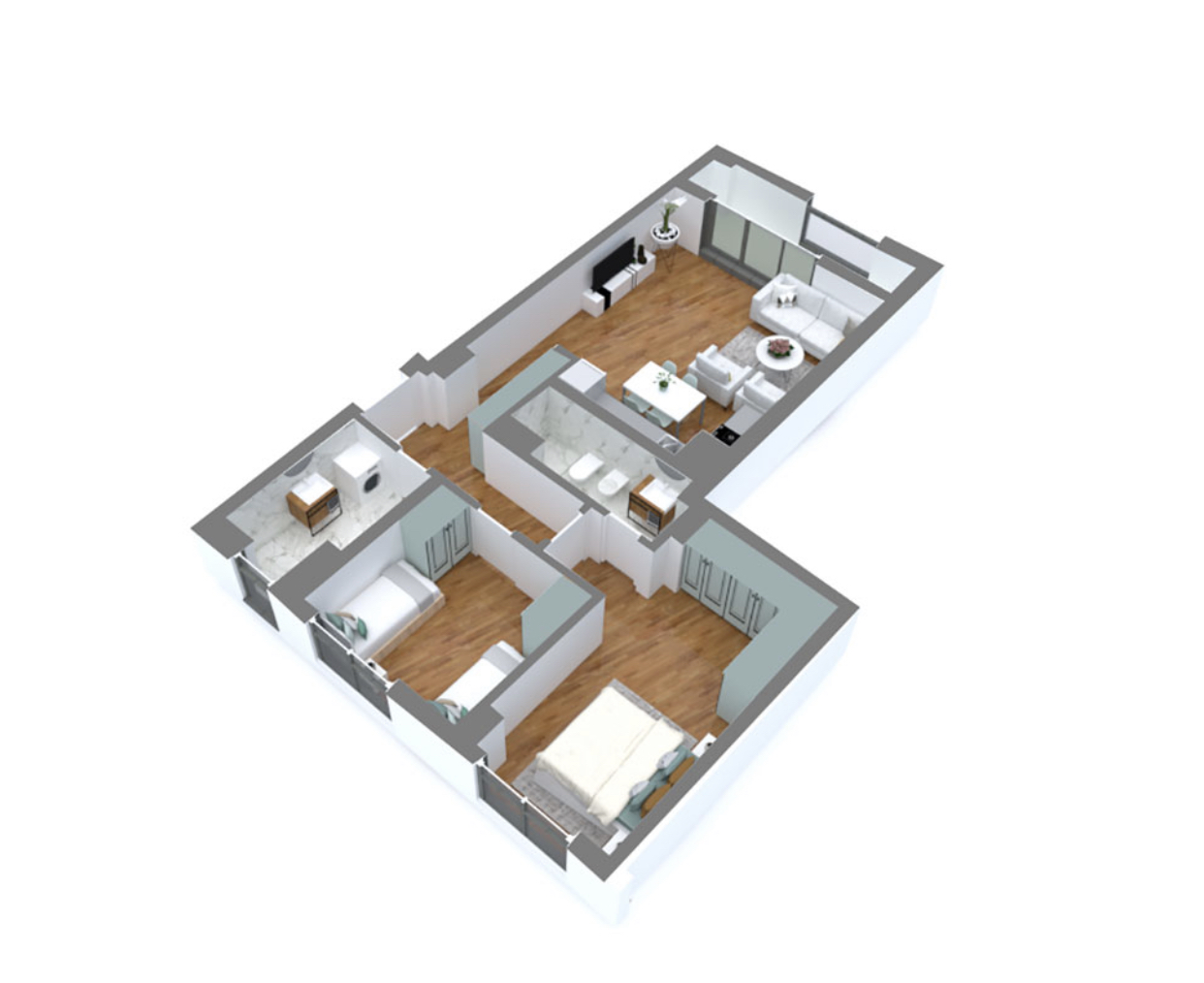 Shes apartament 2+1, me sipërfaqe 104.7 m2, me një orientim të dyanshëm veri-perëndim dhe jug-lindje. Hyrja realizohet me anë të një korridori i cili fillimisht akseson tualetin dhe dhomen e fëmijëve në të djathtë, dhomën matrimoniale përballë dhe në të majtë vazhdohet për në zonën e ditës. Dhomat e gjumit dhe tualeti kanë dritare të orientuara në jug-lindje drejt oborrit të brendshëm. Dhoma matrimoniale përfshin një kënd garderobe dhe ka akses në një tualet të dedikuar. Zona e ditës ka akses dhe diellëzohet nga llozha me orientim veri-perëndim.
