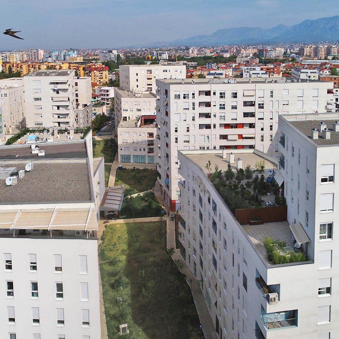 Objekt me fasade te ventiluar, Termoizolim, Oborre te gjelbëruara, rrugë pedonale.