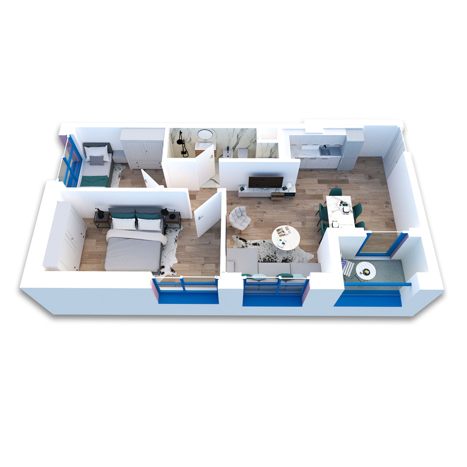 Apartamenti ka nje planimetri te regullt kuadratike qe e ben 100% te shfrytezueshme. Apartamenti eshte i mireorganizuar ne 2 dhoma gjumi me siperfaqe optimale, tualet, kendi i gatimit ne te djathte dhe dhoma e ndenjes e cila ka akses ne llozhen e apartamentit. Apartamenti eshte i mirendricuar gjate gjithe dites dhe ndodhet ne nje kompleks rezidencial i cili ofron te gjitha kushtet per nje jetese te qete e komode. Pagesat jane me keste dhe ofrohet financim deri ne 100%.