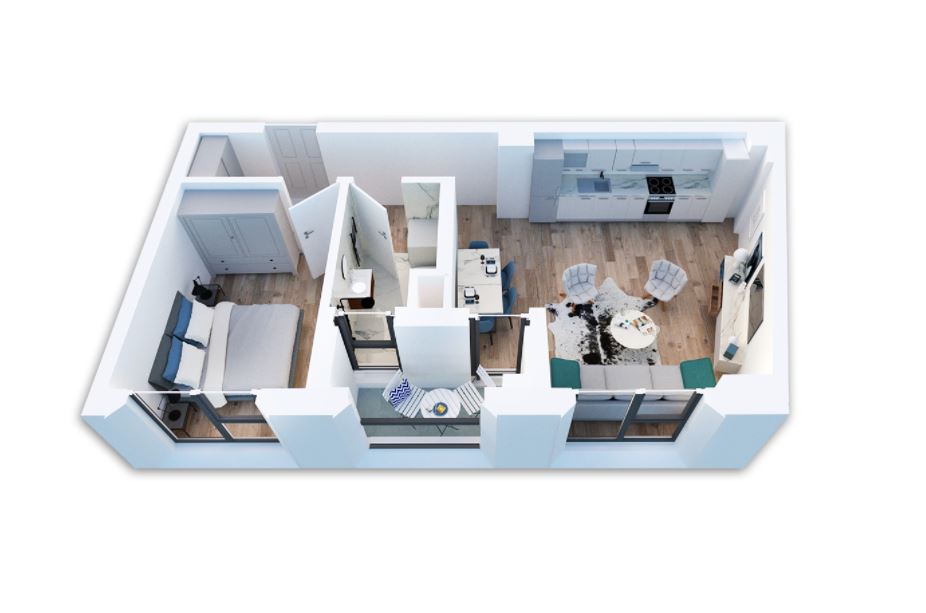 Hyrja per ne apartament behet nepermjet nje korridori shperndares nga ku aksesohet perballe dhoma e gjumit e orientuar ne lindje, tualeti kryesor me dritare, salloni dhe kuzhina me orientim lindje, nga salloni aksesohet llozha qe gjithashtu ka orientim lindje.