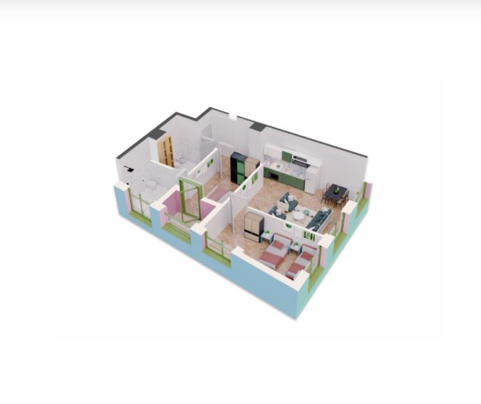 Apartamenti eshte i organizuar ne dhomen e ndenjes se bashku me kendin e gatimit me dalje ne ballkon, dhome gjumi matrimoniale, dhome per femije, dy tualete dhe llozha.