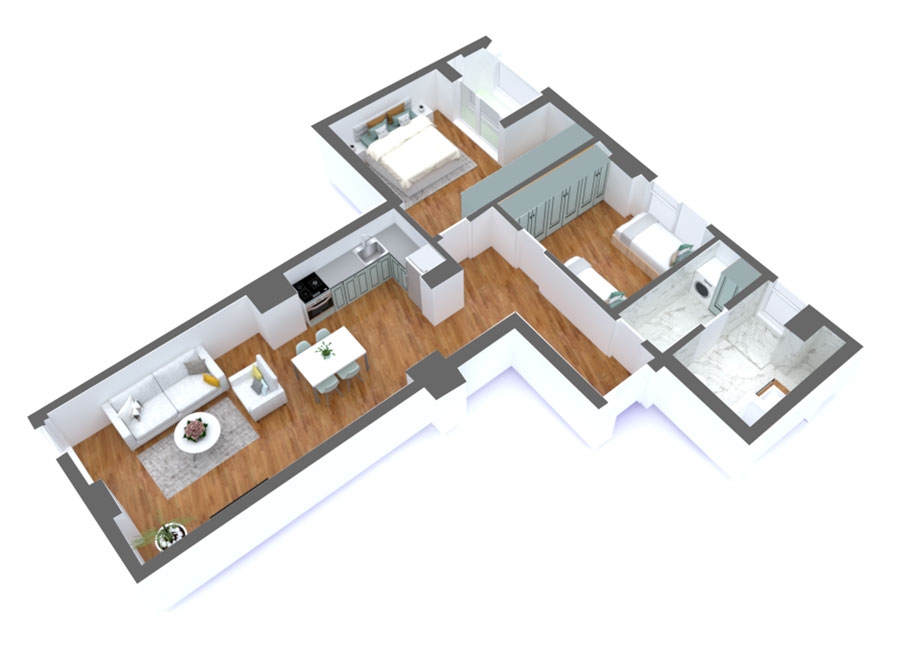Apartament 2+1, me sipërfaqe 104.7 m2, me një orientim të dyanshëm veri-perëndim dhe jug-lindje.