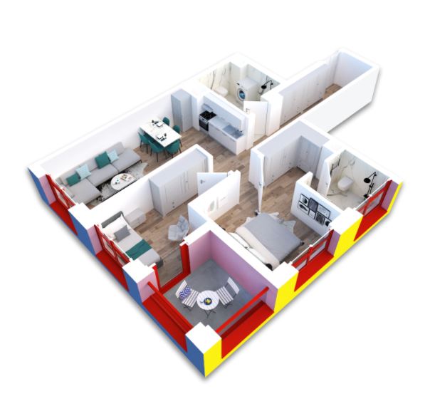 Apartamenti eshte i organizuar ne dhomen e ndenjes se bashku me kendin e gatimit me dalje ne ballkon,dhome gjumi matrimoniale, dhome per femije dhe nje tualet. Hyrja per ne apartament realizohet nepermjet nje korridori te bollshem i cili ben shperndarjen per ne ambientet perkatese, ne te majte eshte tualeti kryesor, perballe zona e dites dhe kendi i kuzhines, nga zona e dites (salloni) aksesohet llozha e cila ka orientim lindje-perendim, aksesohen dhe dhoma e gjumit te cilat kane orientim lindje. Zona e dites ka orientim lindje.