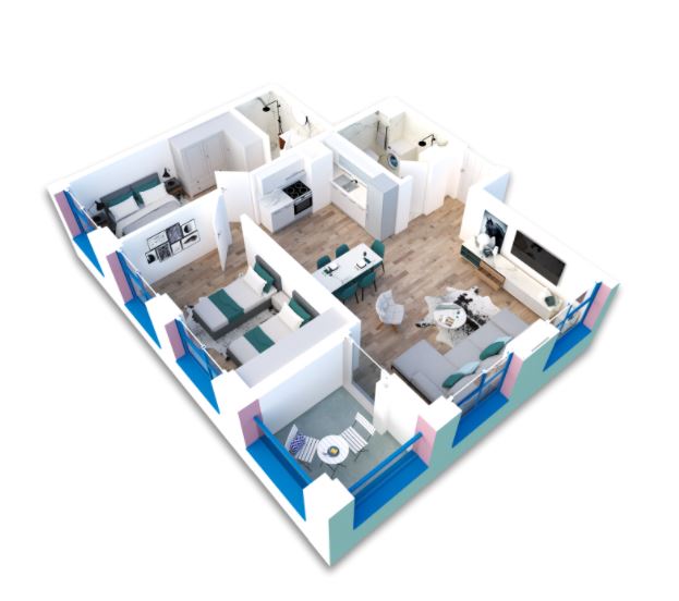 Hyrja per ne apartament realizohet tek zona e dites, salloni dhe kuzhina e vecuar, ne te djathte ne hyrje ndodhet tualeti kryesor, perballe hyrjes ndodhet dhoma e femijeve me orientim perendim, nga salloni aksesohet llozha e apartamentit me orientim te trefishte jug-lindje-perendim. Ne te djathte ne hyrje ndodhet dhoma e gjumit matrimoniale e cila ka tualet te dedikuar dhe eshte me orientim perendim.