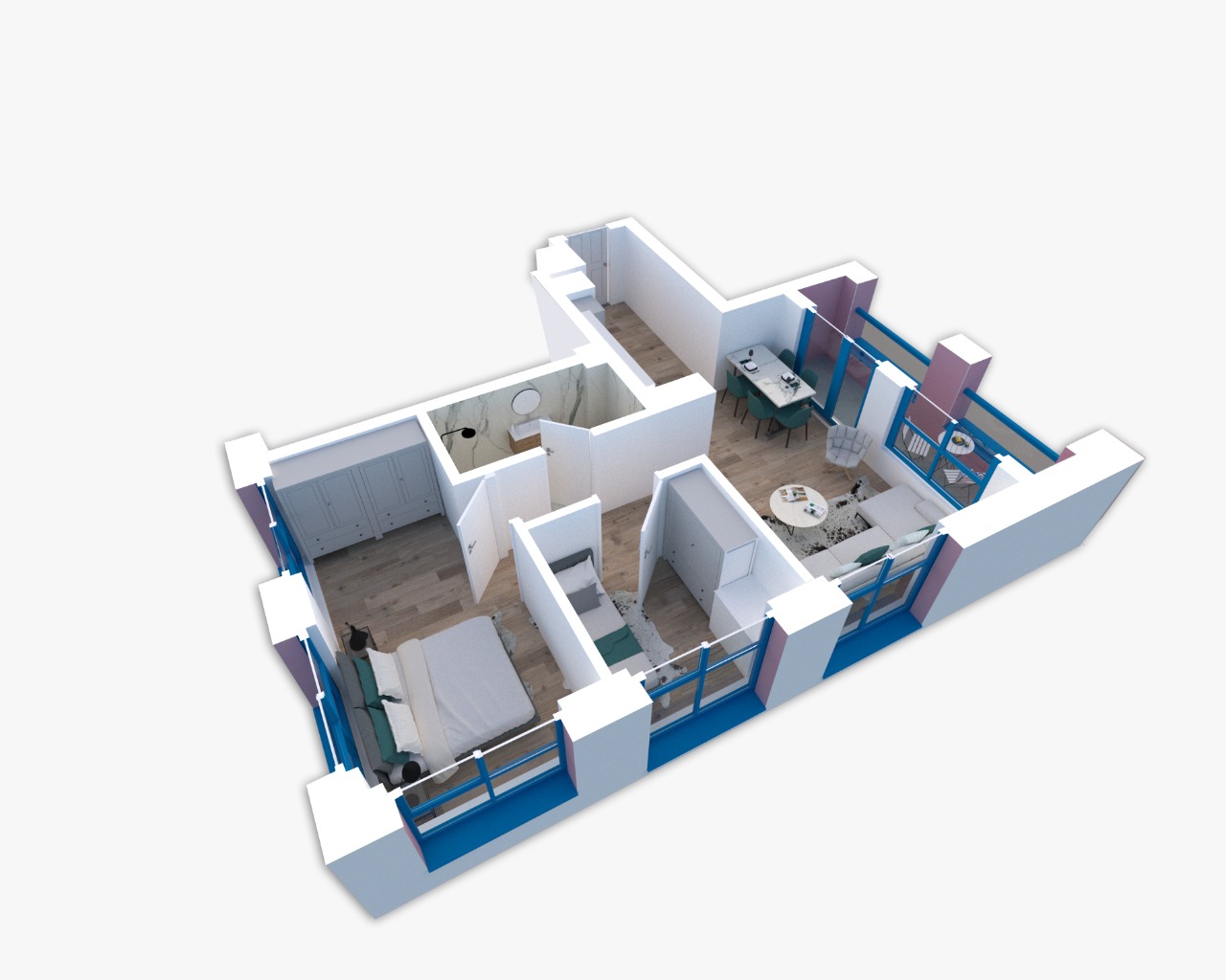 Organizohet ne nje sallon bashke me kendin e kuzhines, dy dhoma gjumi, nje tualet dhe nje llozhe. Hyrja per ne apartament realizohet nepermjet nje korridorri te vogel, i cili ben shperndarjen per ne ambientet perkatese.