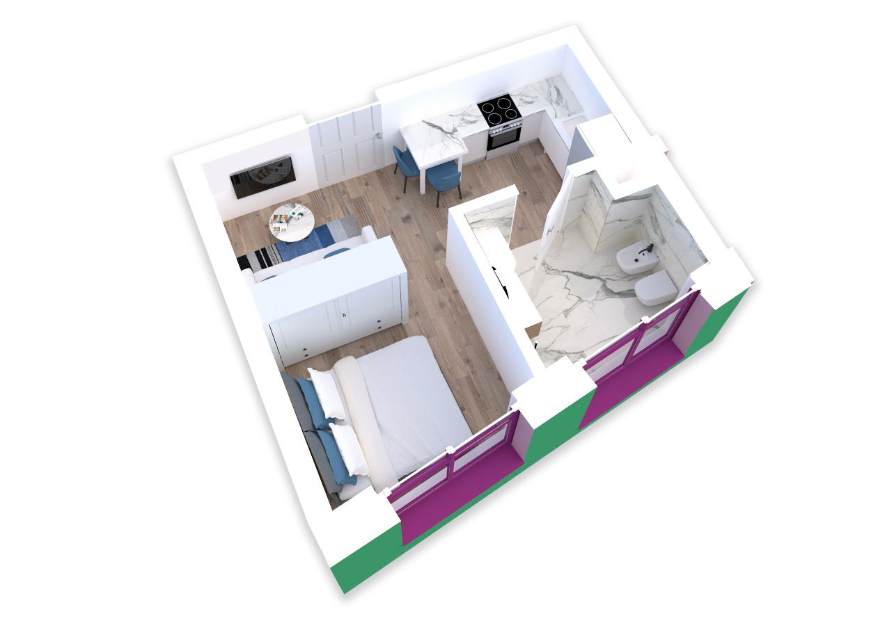 Garsonieria ka siperfaqe 30m2, orientim veri-lindje dhe ndodhet ne katin e peste.