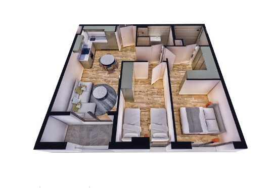 Apartament 2+1, me sipërfaqe 92.5 m2, me orientim lindje. Hyrja realizohet me anë të nje koridori...