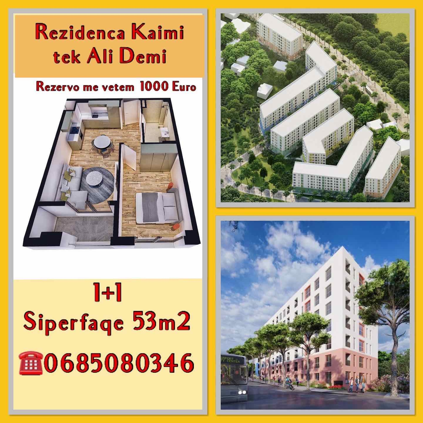 Apartament 1+1, me sipërfaqe 53.3 m2 ne rezidencen Kaimi. Apartamenti ka nje planimetri te regullt kuadratike e shfrytezuar maksimalisht.
