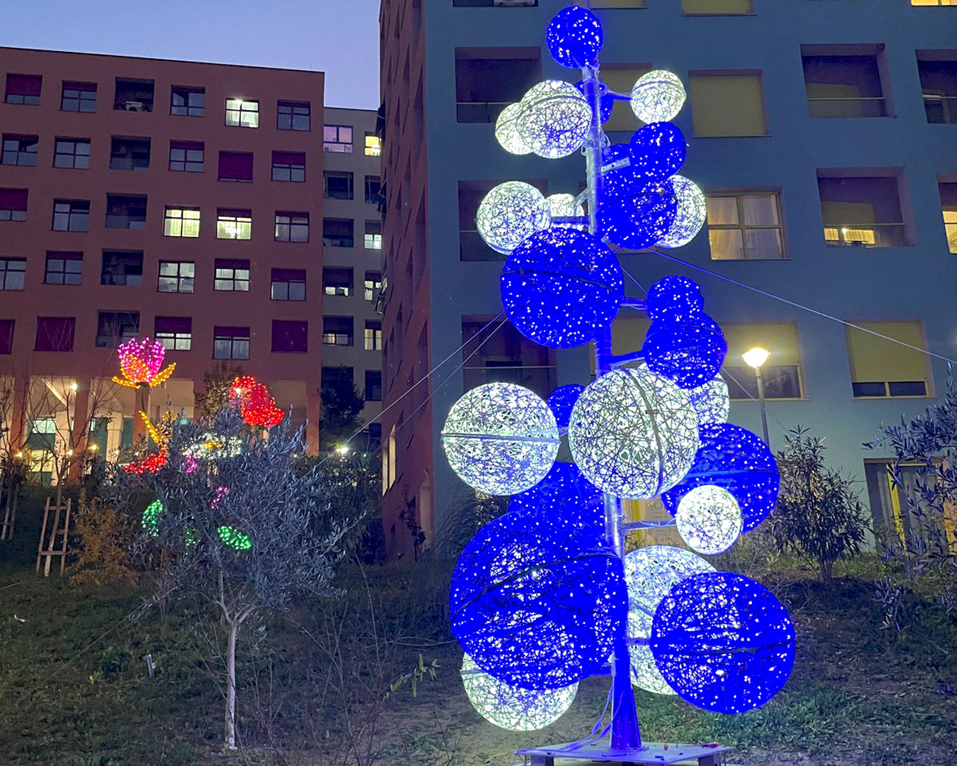 At Mangalem 21, the New Year tree installation has been set up, created by ADS Design, featuring blue and white illuminated spheres that create a modern and festive look. The decor has draw the attention of residents and marked the beginning of the joyful year end atmosphere