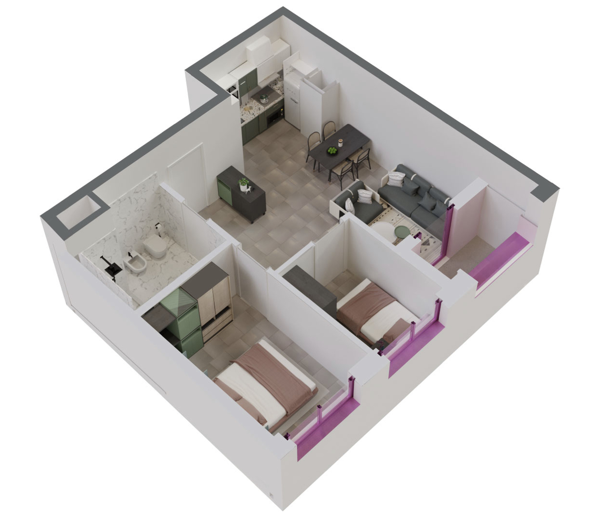 Apartamenti ndodhet ne katin e pare te banimit te nje pallati te ri te pajisur me ashensor dhe ka nje siperfaqe totale prej 68m², organizohet ne nje sallon te bollshem dhe kend kuzhine me dalje ne ballkon,2 dhoma gjumi, 1 tualet dhe llozhe. Orientimi i apartamentit eshte perendim, ka ndricim natyral ne pjesen me te madhe te dites. Apartamenti aktualisht sapo eshte perfunduar dhe jane bere rifiniturat permbyllese si parketi, hidrosanitaret e tualetit, patinimet etj.