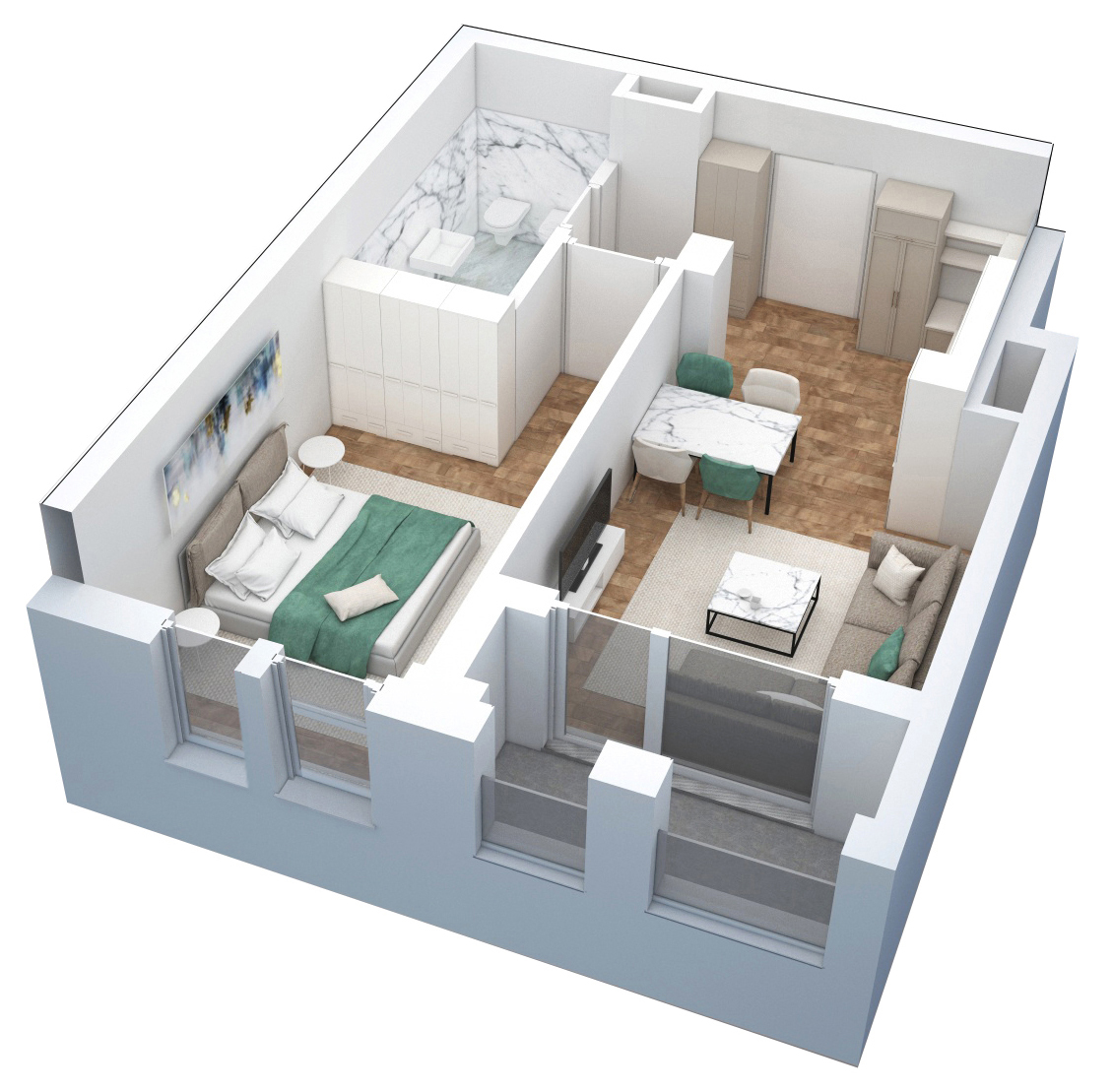 Apartamenti eshte I mireorganizuar ne nje dhome gjumi, tualeti, dhoma e ndenjes dhe kendi I gatimit. Apartamenti I ka hapesirat mjaft mire te organizuara cka e ben siperfaqen 100% te shfrytezueshme. Ai ndodhet ne nje kompleks rezidencial I cili ofron te gjitha kushtet per nje jetese te qete e komode ne nje nga zonat me te preferuara ne Tirane. Rezidenca eshte me fasade te ventiluar, tualete inkaso, zeizolim akustik, termoizolim, hidroizolim, ventilim i dedikuar dhe e projektuar per te perballuar termete deri ne 10 balle.