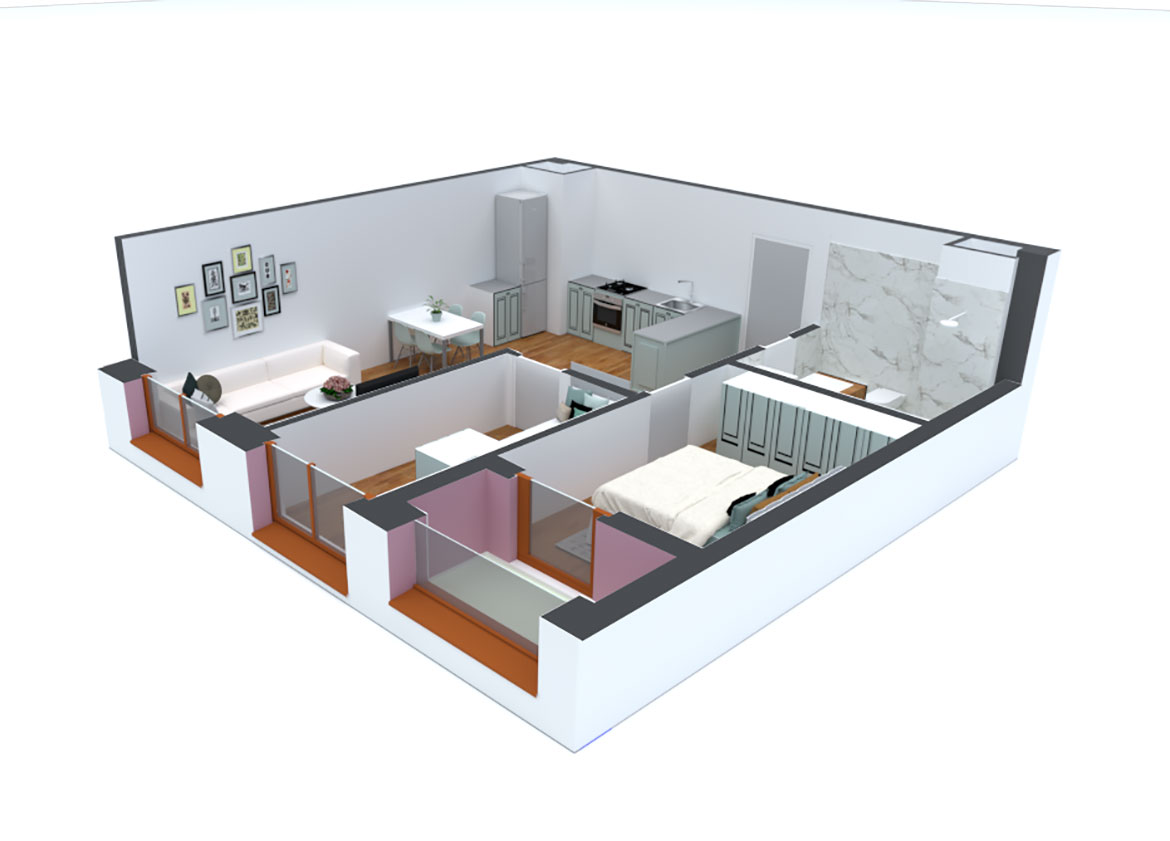 Apartamenti ka nje planimetri te regullt kuadratike qe e ben 100% te shfrytezueshme. Apartamenti eshte i mireorganizuar ne dhomen e ndenjes me siperfaqe optimale, tualetin e dites, kendin i gatimit dhe dhomat e gjumit, ku dhoma matrimoniale ka akses ne llozhen e apartamentit.