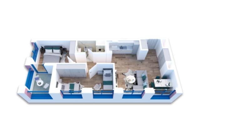 Apartamenti ndodhet ne katin e shtate, ka orientim veri-lindje-perendim dhe organizohet ne dhomen e ndenjes se bashku me kendin e gatimit, nje dhome gjumi matrimoniale, nje dhome per femije, tualeti i dites dhe llozha e apartamentit.
