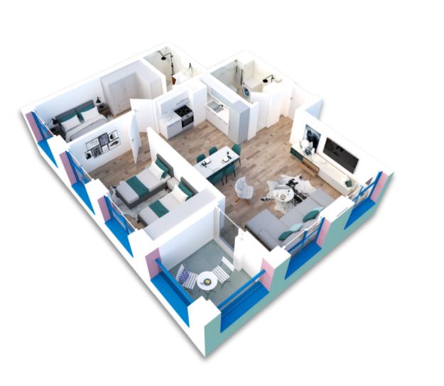 Apartamenti eshte i organizuar ne dhomen e ndenjes se bashku me kendin e gatimit me dalje ne ballkon, dhome gjumi matrimoniale, dhome per femije, dy tualete dhe llozha.