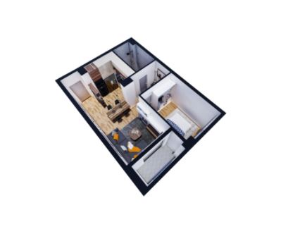 Hyrja per ne apartament realizohet nepermjet nje korridori te vogel nga ku aksesohen ambientet perkatese; ne te majte tualeti kryesor me aspirim te dedikuar, perballe kuzhina dhe salloni te orientuara ne jug. Ne te djathte te hyrjes ndodhet dhoma e gjumit e orientuar ne jug. Nga salloni aksesohet  llozha e apartamentit e orientuar gjithashtu ne jug.