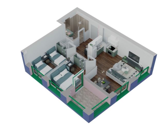 Hyrja per nje apartament realizohet nepermjet nje korridori shperndares, ku perballe jane dhoma e femijeve dhe dhoma matrimoniale nga ku aksesohet llozha me orientim jug-lindje, tualeti ne te djathe. Apartamenti eshte i orientuar ne jug-lindje dhe ka drite, ndricim natyral gjate gjithe dites.