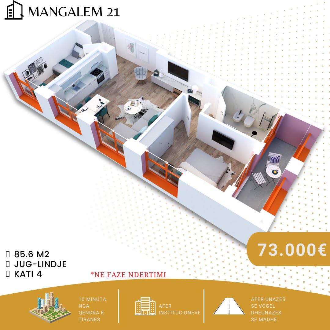 Shiten apartamente me hipoteke te kompleksi Mangalem 21, Ali Demi me cmimet me konkuruese ne treg!  Kompleksi ofron te gjitha fasilitetet per nje jetese te qete e komode si ambjente te gjelberuara dhe pa makina, kende lojerash per femije, psta bicikletash etj. Zgjidhni sot apartamentin tuaj dhe do te gjeni cilesi superiore e komoditetin e kerkuar.
