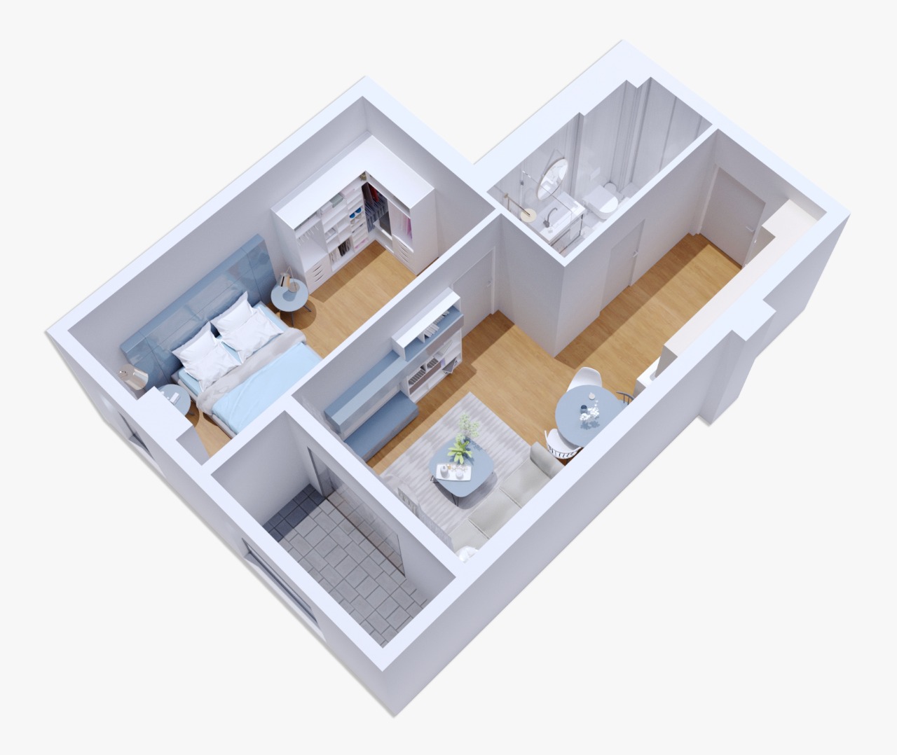 Apartamenti ka nje siperfaqe totale prej 59.6m2 dhe eshte i organizuar ne sallon dhe kuzhine, nje dhome gjumi, nje tualet dhe llozha. Apartamenti ka orinetim jug dhe ndodhet ne katin e dyte.