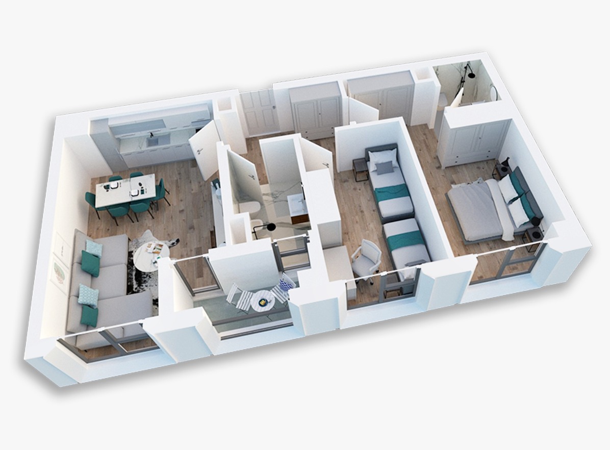 Apartamenti ka siperfaqje totale 92.5m2, ndodhet ne katin e trete ne nje pallat ne faze ndertimi. Organizohet ne sallon dhe kuzhine, dy dhoma gjumi, dy tualete dhe ballkon.