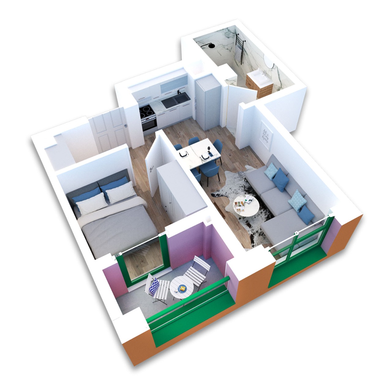 Siperfaqja e apartamentit 50 m2 eshte e mireorganizuar ne dhome ndenje , dhome gjumi , tualetin e dites dhe ballkonin.