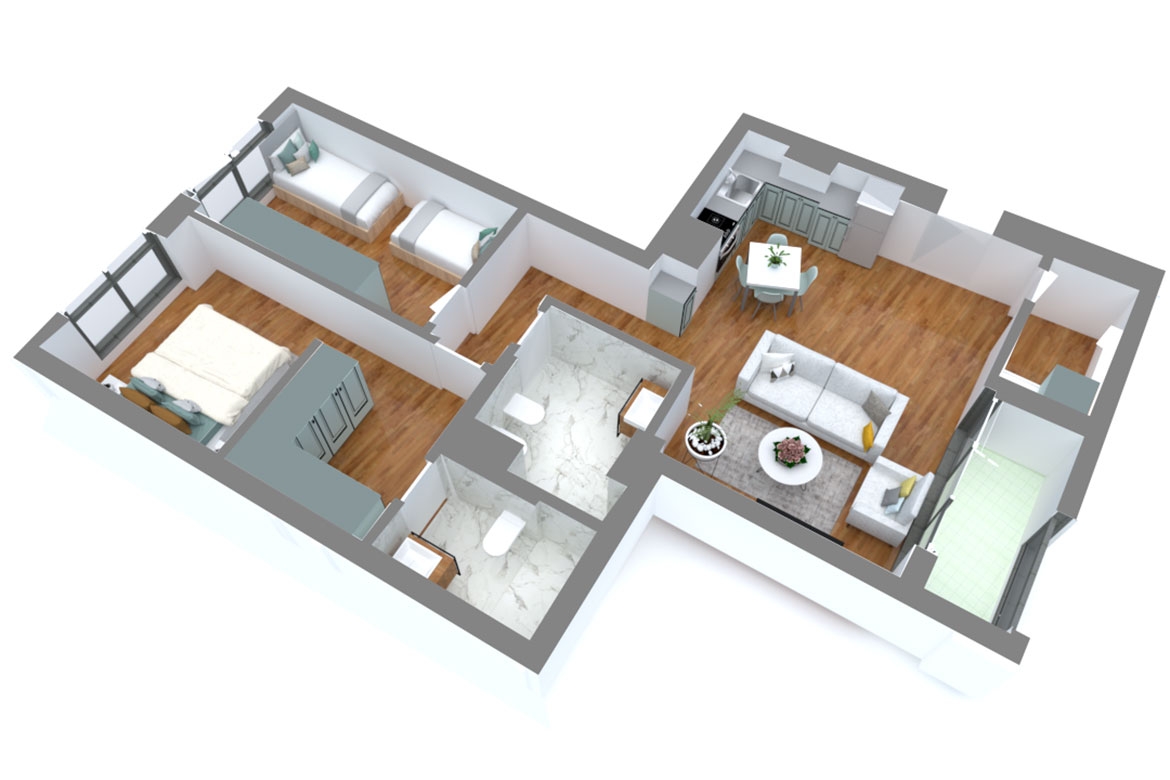 Apartamenti pozicionohet ne katin e tete me orientim jug lindje dhe organizohet nga  nje sallon i bollshem me kuzhine te perbashket, 2 dhoma gjumi dhe 2 tualete. Objekti eshte ne ndertim e siper dhe mbaron ne dhjetor te vitit 2021. Kompleski ku apartamenti ndodhet eshte ideuar si nje hapesire multifunksionale me shume fasilitete dhe cilesi te larte ndertimi.