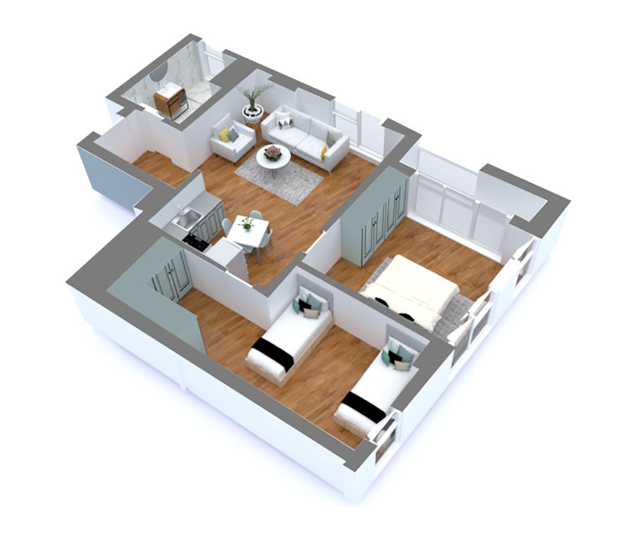 Shitet apartament 2+1 ne Tirane tek Bulevardi i Ri, me sipërfaqe 93.7 m2, me një orientim të dyanshëm jug-perëndim dhe jug-lindje. Hyrja realizohet me anë të një korridori të vogël përballë të cilit gjendet zona e ditës, ndërsa në të majtë tualeti. Lidhja me dhomat e gjumit bëhet në zonën e ditës e cila ka dritare me orientim jug-lindje. Dhomat e fëmijëve ka dritare me orientim jug-perëndim. Dhoma matrimoniale ka 2 dritare me orientim jugperëndim dhe akses në llozhën me orientim jug-lindje.