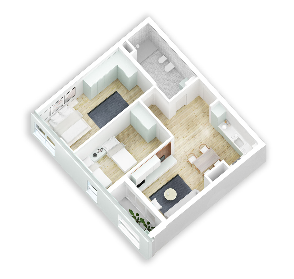 Shitet apartament 2+1 ne Tirane tek Bulevardi i Ri.Me sipërfaqe 96.7 m2, me një orientim të dyanshëm veri-perëndim dhe jug-lindje. Hyrja realizohet me anë të një korridori i cili fillimisht bën lidhjen me tualetin dhe dhomat e gjumit në të majtë, më pas zonën e ditës në të djathtë. Dhomat e gjumit kanë dritare me orientim veri-perëndimor në drejtim të oborrit të brendshëm. Zona e ditës ka akses në llozhën e orientuar drejt jug-lindjes.