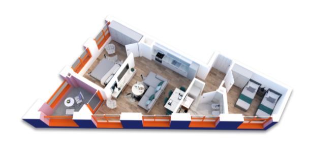 Apartamenti ndodhet ne katin e trete, ka orientim veri-lindje-perendim dhe organizohet ne dhomen e ndenjes se bashku me kendin e gatimit, nje dhome gjumi matrimoniale, nje dhome per femije, tualeti i dites dhe llozha e apartamentit.