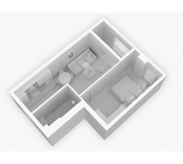 Apartamenti 1+1 ka nje siperfaqe totale prej 59.6 m2 dhe eshte i organizuar ne sallon te madh dhe kuzhine, dy dhoma gjumi, dy tualete kryesor dhe llozha.