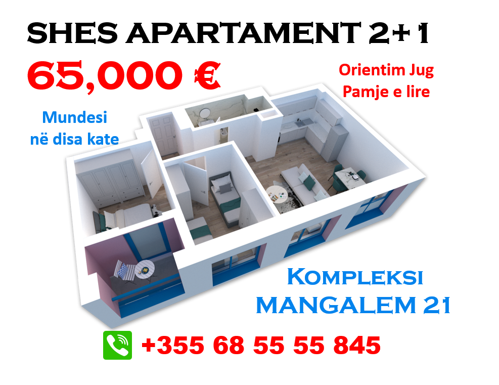Shes apartament 2+1 me pamje te lire te kompleksi Mangalem 21!