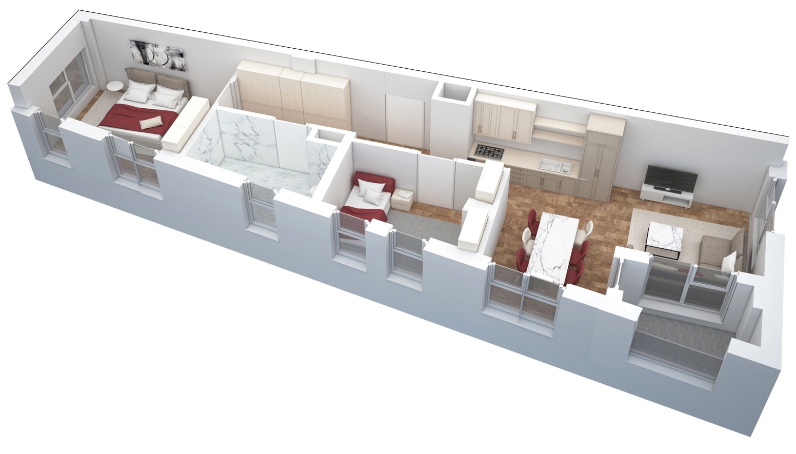 Apartament 2+1, me sipërfaqe 104.7 m2, me një orientim të dyanshëm veri-perëndim dhe jug-lindje tek rezidenca Marga.