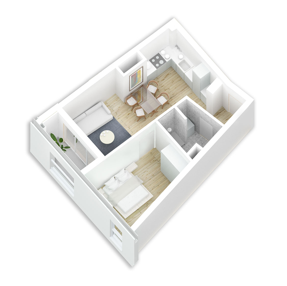 Apartament 1+1, me sipërfaqe 62.8 m2, me një orientim midis jugut dhe perëndimit. Hyrja realizohet me anë të një korridori të vogël, nga ku aksesohet tualeti dhe më pas zona e ditës. Zona e ditës ka akses në llozhën e orientuar drejt jug-perëndimit dhe lidhet me dhomën e gjumit e cila ka të njëjtin orientim.