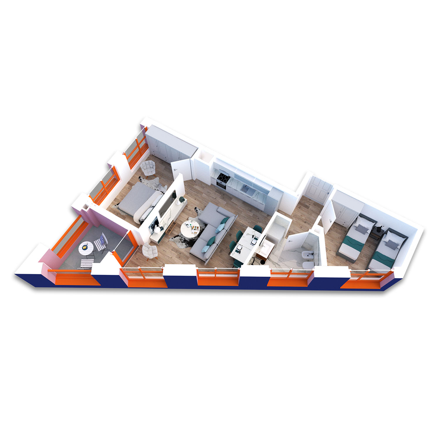 Hyrja per ne apartament realizohet nepermjet nje korridori te vogel ku ne te majte ndodhet dhoma e femijeve e orientuar ne perendim, perballe hyrjes ndodhet tualeti kryesor i cili eshte me dritare, ne te djathte te hyrjes ndodhet zona e dites, kuzhina dhe ambienti ndenjes, nga salloni aksesohen dhoma e gjumit matrimoniale e orientuar ne lindje dhe llozha e orientuar ne veri-lindje. Salloni ndricohet ne veri-perendim.