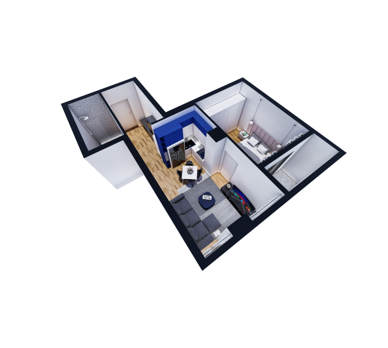 Apartamenti organizohet ne zonen e dites (sallon dhe kuzhine), tualeti kryesor, dhoma e gjumit dhe llozha.