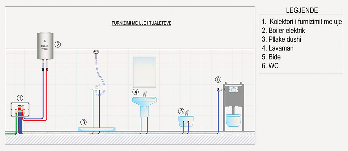 In the apartment water supply plant there is a scheme of how these apartments and the material used for this furniture are supplied. The scheme used for this furniture is that, the supply line from the urban network supplies the water repositorys, by pumping the water to the main supply line of the group of contractors and then with separate lines is supplied each apartment.