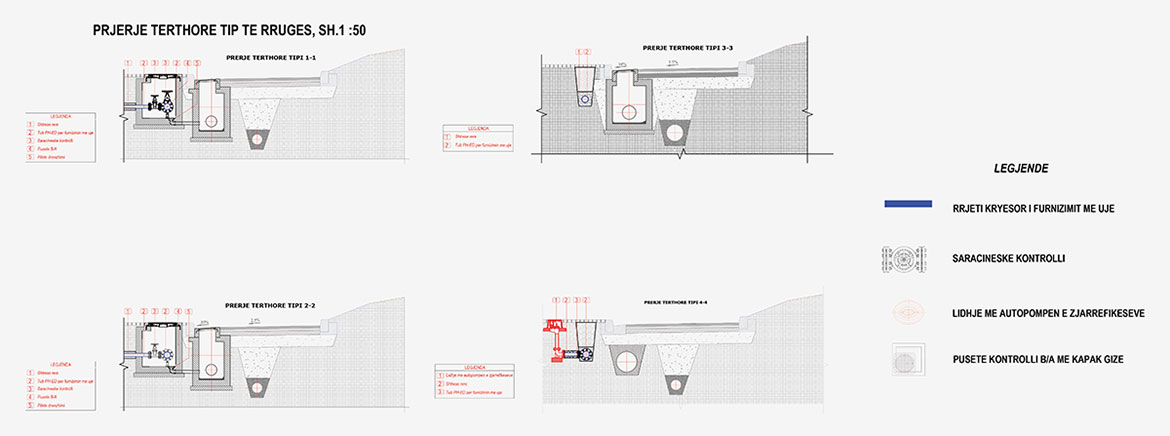 The external water supply network of the complex is designed with ring connection, which means that the buildings are supplied with two networks. This network is resistant to pressure losses and in the event that one of the lines is defective, water is supplied by the other line. In this network are also installed underground fire hydrants, which in case of fire, the autoswitches are supplied with water in these hydrants without having to return to the base for refueling.