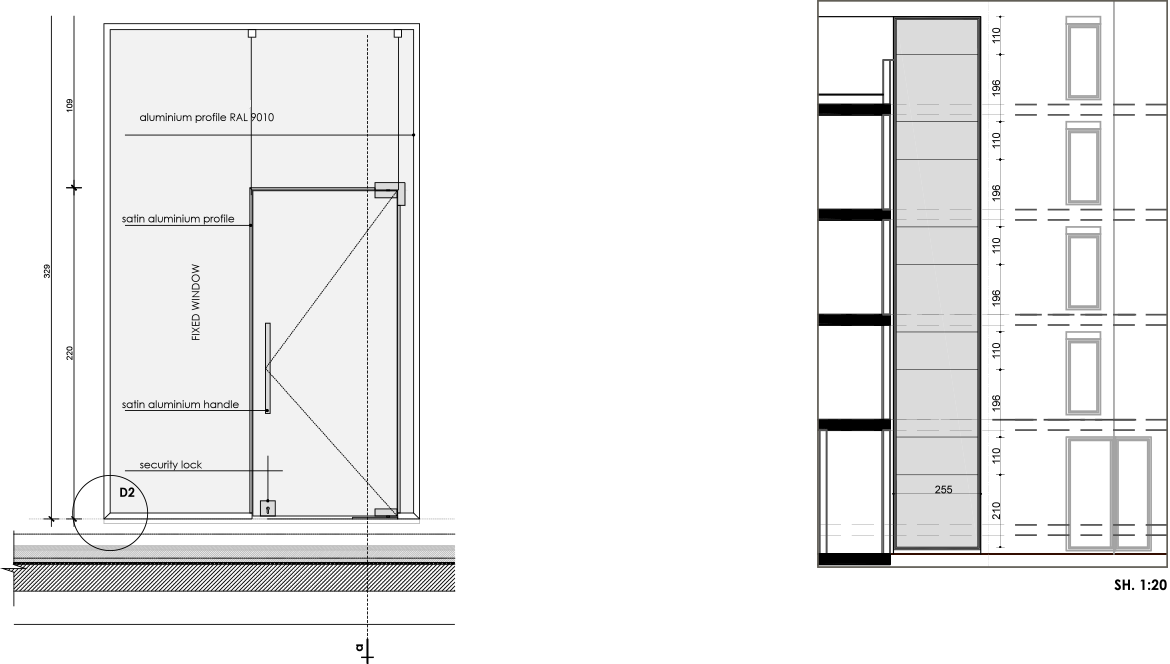 Windows façade, mainly used for commercial units and shops, are conceived transparent, by offering very good exposure opportunities. The glass sheets are sealed as a picture on the aluminum structure, which provides maximum security and creates a very elegant look.
