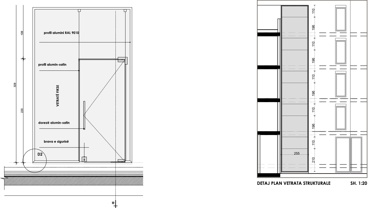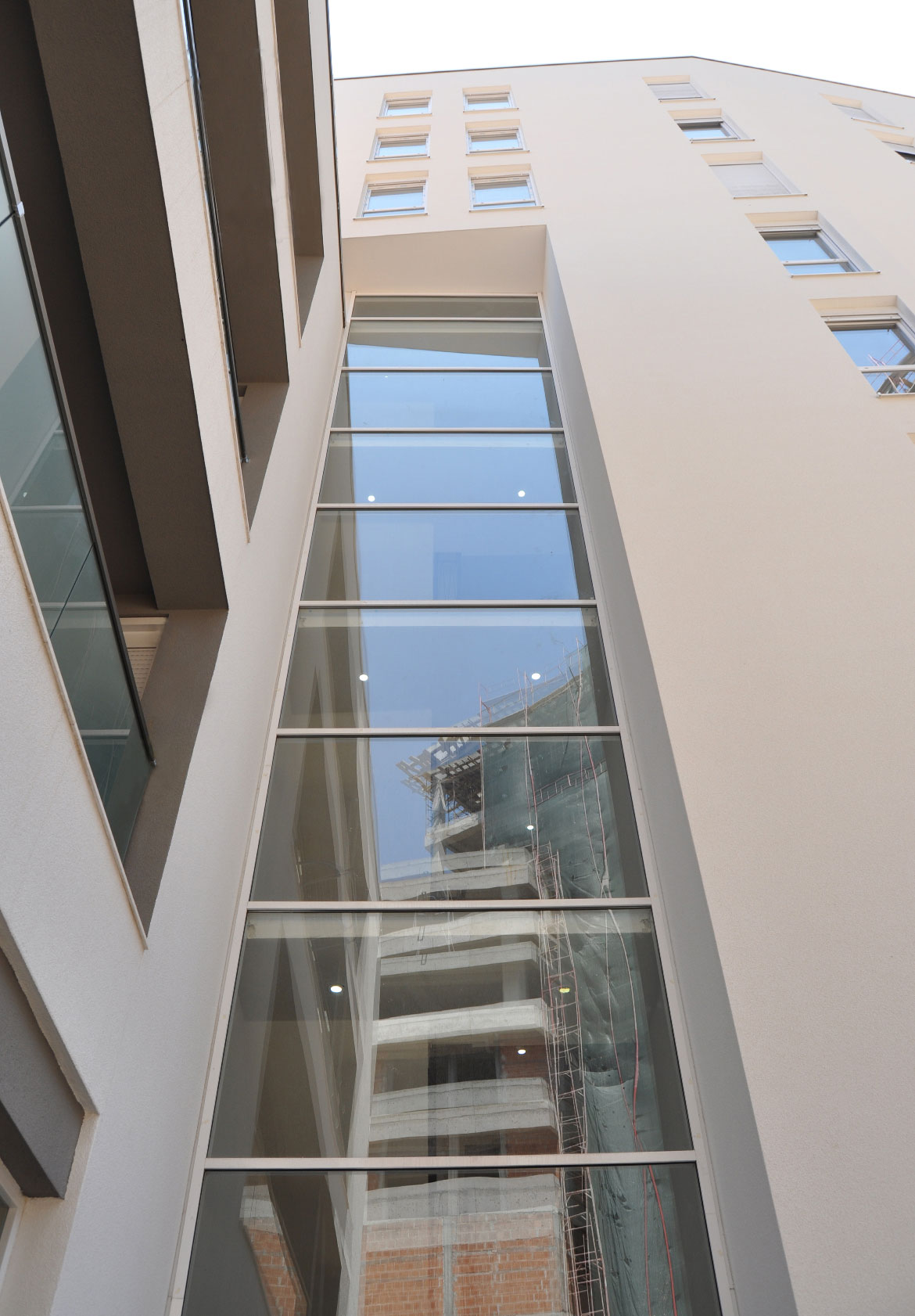 Fasadat e xhamit, të përdorura kryesisht për njësitë tregtare dhe dyqanet, janë të konceptuara si transparente, duke ofruar mundësi shumë të mira ekspozimi. Fletat e xhamit qëndrojnë të kapura si një tablo mbi një strukturë alumini, e cila ofron siguri maksimale dhe krijon një pamje shumë elegante.
