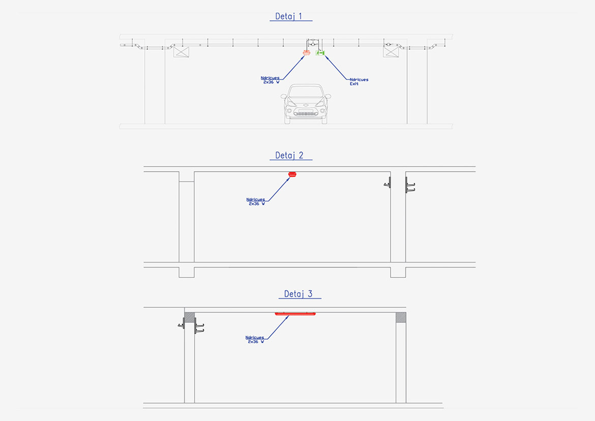 Në katet -1 janë përdorur ndriçues linear 2x36 flouroshent ose ndriçues LED. Sasia e ndriçuesve është e tillë që të kapen normat e fluksit të ndriçimit, rreth 150 lux. Ndriçuesit në katet -1 mund të jenë të fiksuar në tavan me prozheniere ose mund të jenë të fiksuar në kanalinat metalike. Në të gjitha rastet ndriçuesit janë në podrume janë të instaluar jashtë murit dhe janë linear.