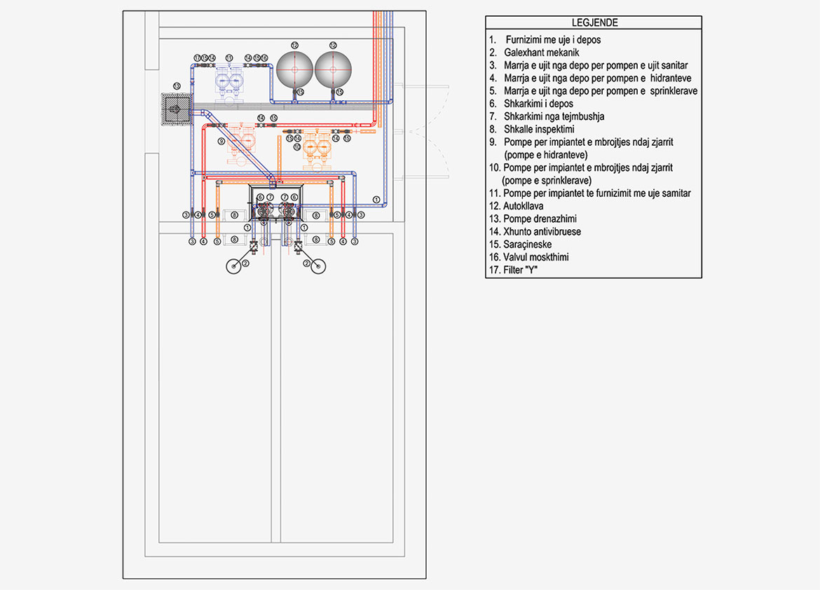 Ambjenti teknik është një nga ambientet më të rëndësishme të godinës dhe si pasojë i është kushtuar një rëndësi e veçantë për ndërtimin e tij. Ambienti teknik është i ndërtuar nga grupi i furnizimit me ujë, depot e ujit, pompa e impiantit te ujit sanitar, autoklava, pompat e impiantit te mbrojtjes ndaj zjarrit.